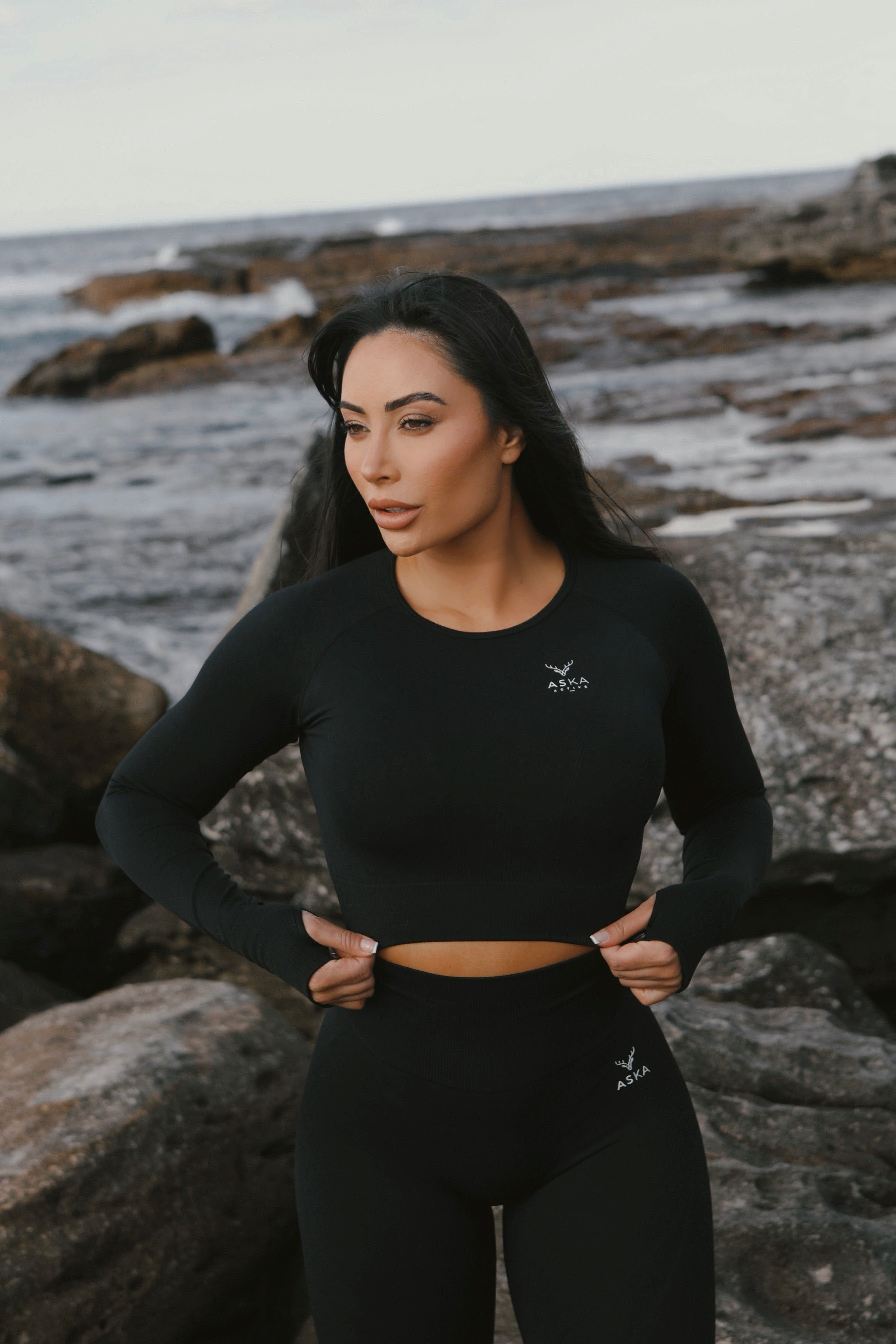 Elevate your activewear with our long sleeve crop top, crafted from a sleek blend of 90% nylon and 10% spandex for a perfect fit that moves with you.