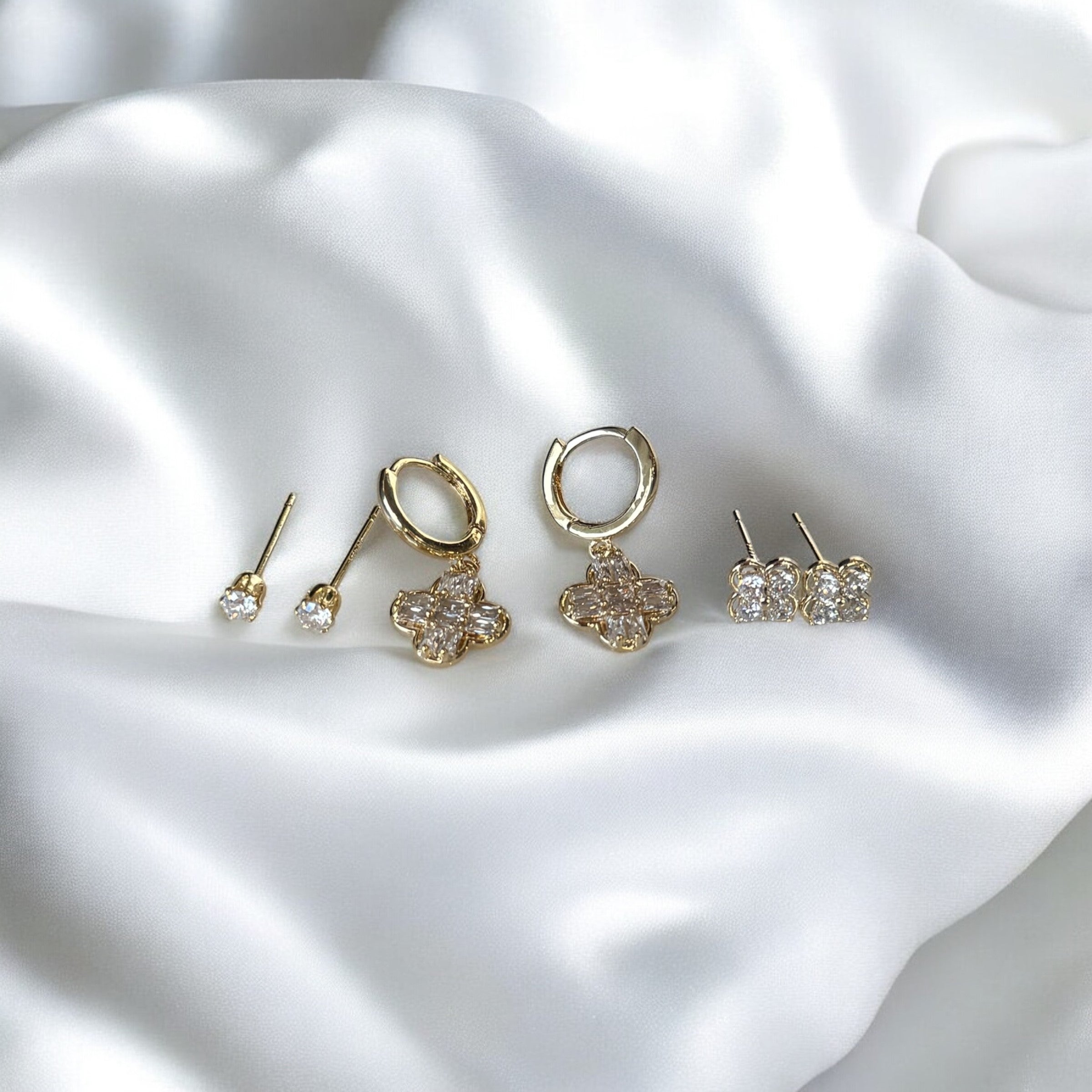 This set includes six exquisite earrings: two stud flower earrings, two huggie dangle flower earrings, and two classic stud earrings.