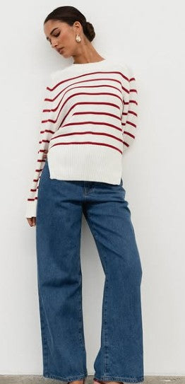 Stay effortlessly chic with our Breton Stripe Oversized Knit Sweater. Designed with a relaxed fit, this cozy knit features bold red stripes on a crisp white base, offering a timeless yet modern aesthetic. With extra-long sleeves, ribbed cuffs, and a slightly cropped hem, this sweater pairs perfectly with high-waisted jeans for an easy, off-duty look. Crafted from a soft and breathable fabric blend, it’s ideal for layering across seasons. Style it with statement earrings and sleek hair for a sophisticated yet laid-back vibe.
