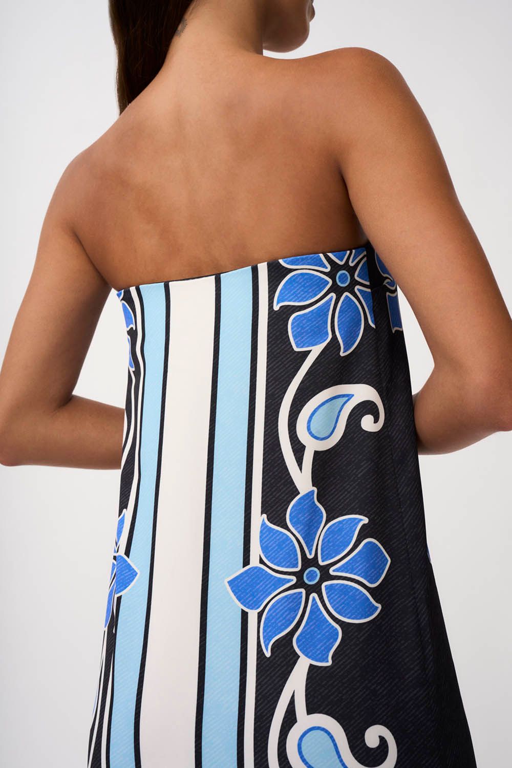 The Azure Granada Strapless Dress is features a bold print in different shades of blue. The strapless, ankle length design is slightly relaxed and a standout piece for your wardrobe.