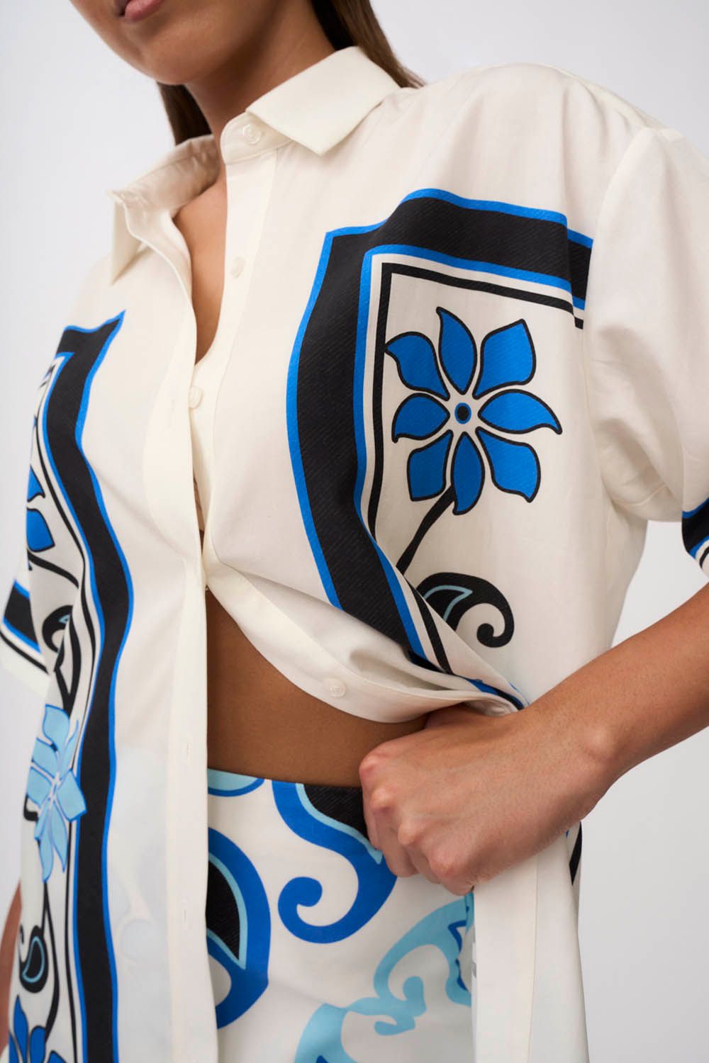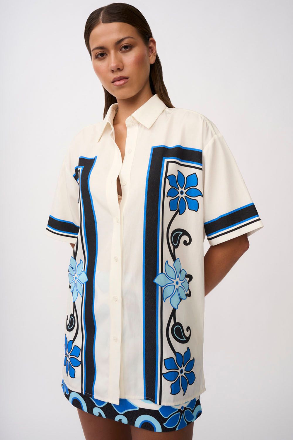 The Azure Granada Flower Shirt features button up front with collar neckline, and top-stitching detail on hem and sleeve hem. The relaxed fit and striking print in different shades of blue, makes it an ultimate Summer wardrobe addition.