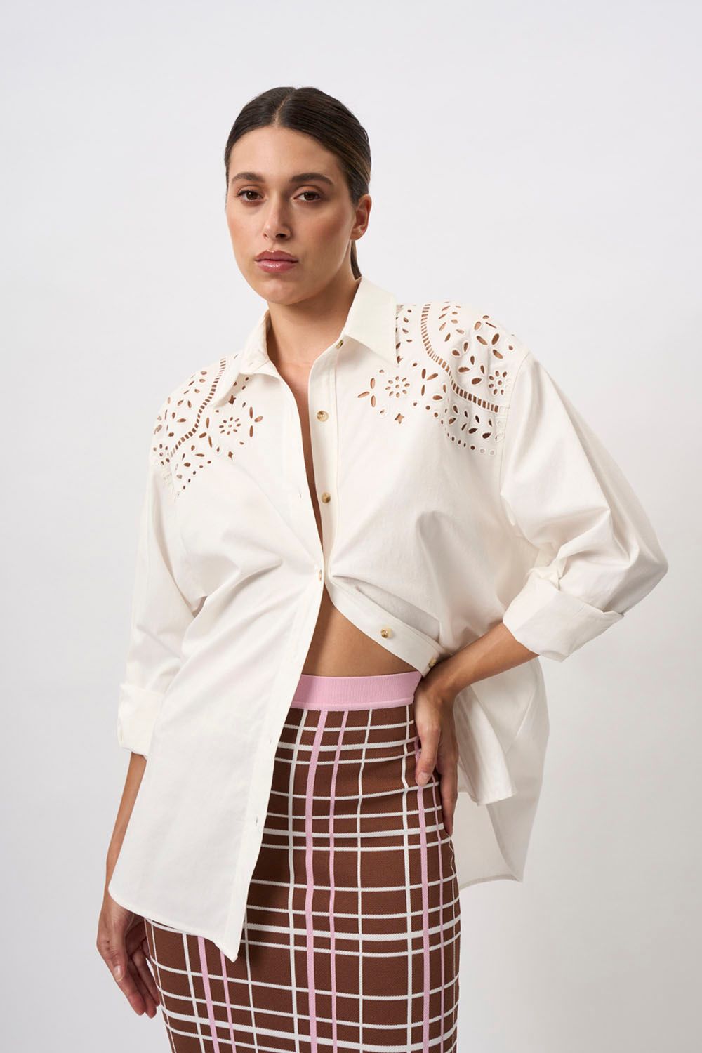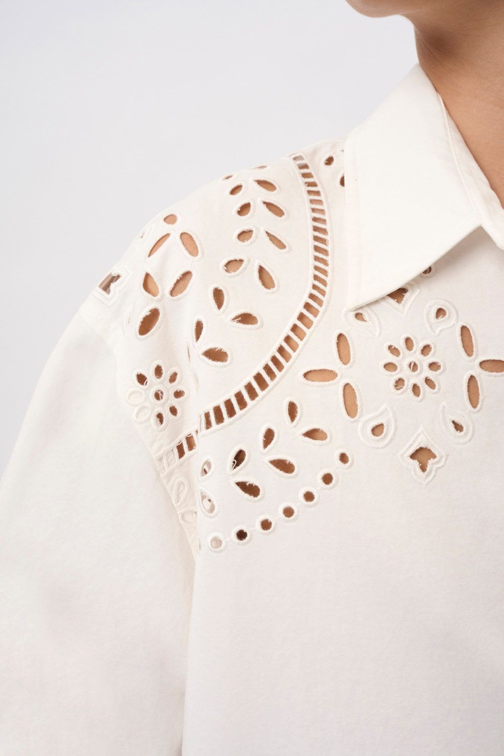 The Bowie Broidery Shirt is an oversized fit shirt made from a mid weight cotton blend fabrication with custom designed embroidery cut work on the front chest.
