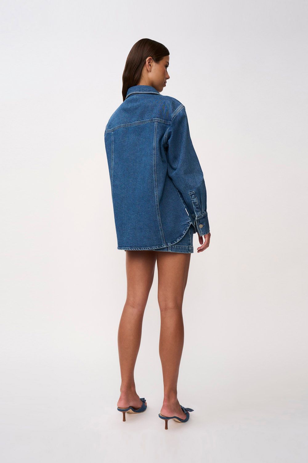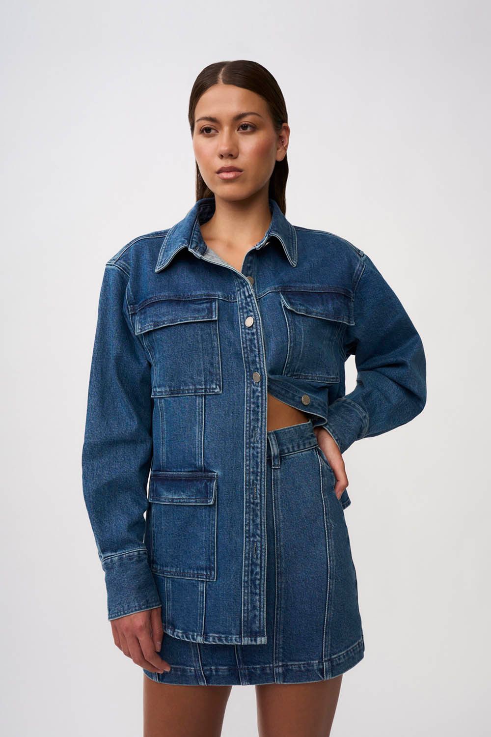 The Della Denim structured jacket is a reimagined classic made from a comfortable stretch denim with patch pockets on the front and brushed silver nickle shank buttons. This piece is a relaxed fit with a slouchy sleeve.
