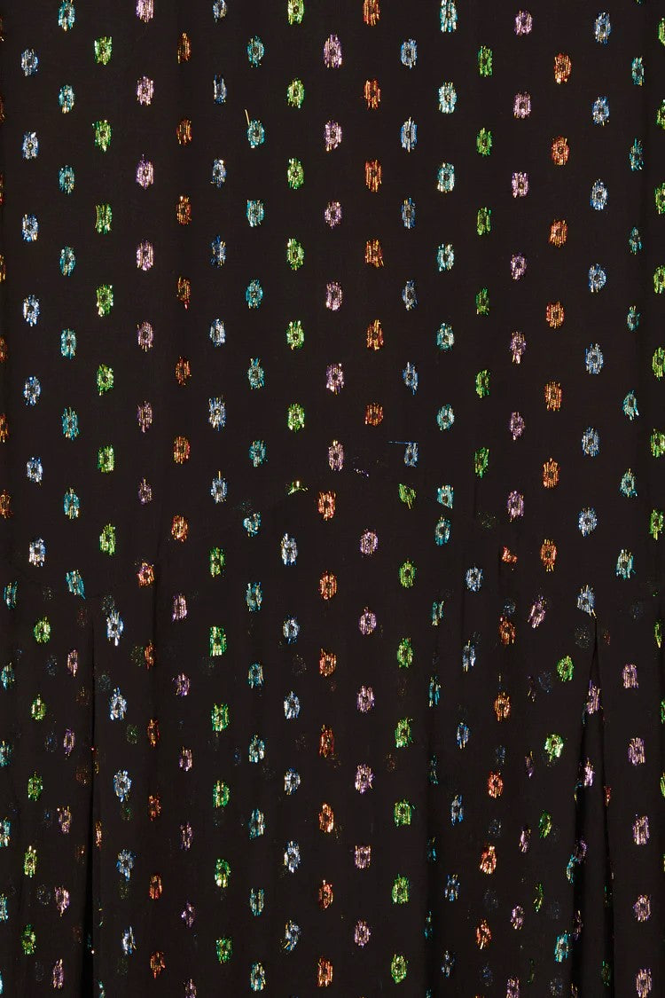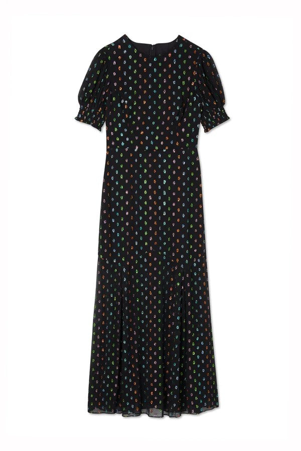 A truly elegant shape, accentuated by a voluminous skirt (creates gorgeous movement as you walk) and a slight puff sleeve. A sheer outer fabric dotted with a rainbow of metallic flecks, and lined down to the knee. The seam at the waist ensures a defined shape and fit. Pair with a little heel or trainers for everyday joyful dressing.