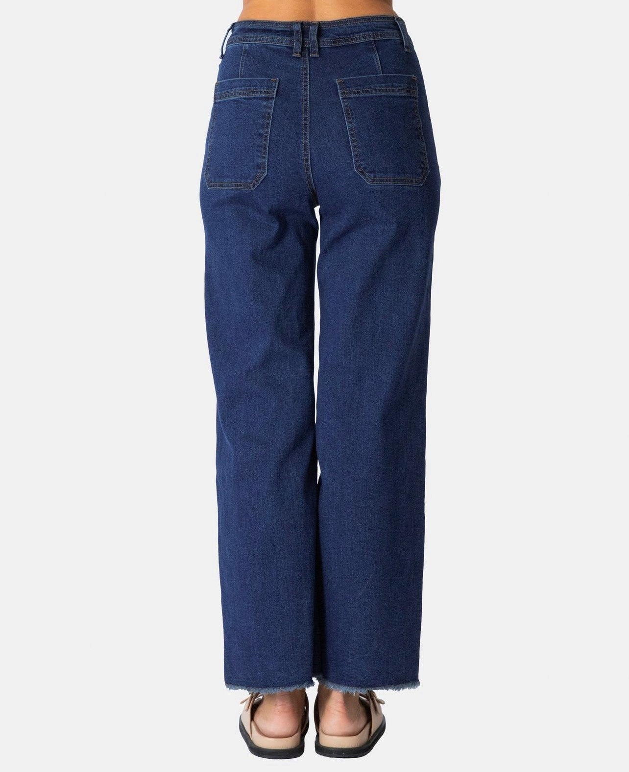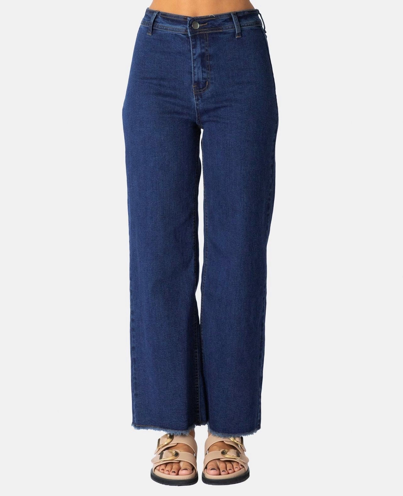 Revamp your denim collection with our ultra-trendy Dark Denim Pants featuring a unique ripped look at the bottom for an edgy yet chic style.