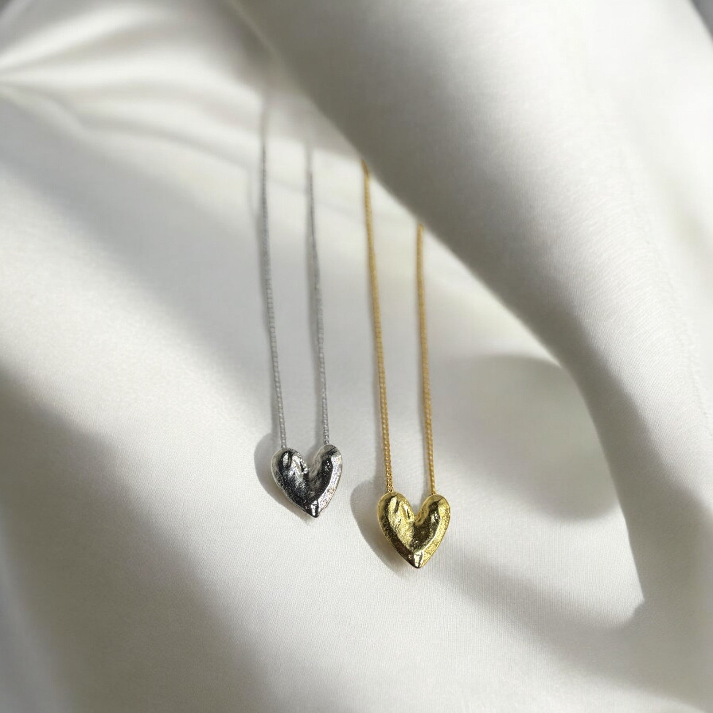 Available in both gold and silver, this necklace features a medium-sized heart pendant suspended on a thin, dainty chain for a subtle yet charming look.
