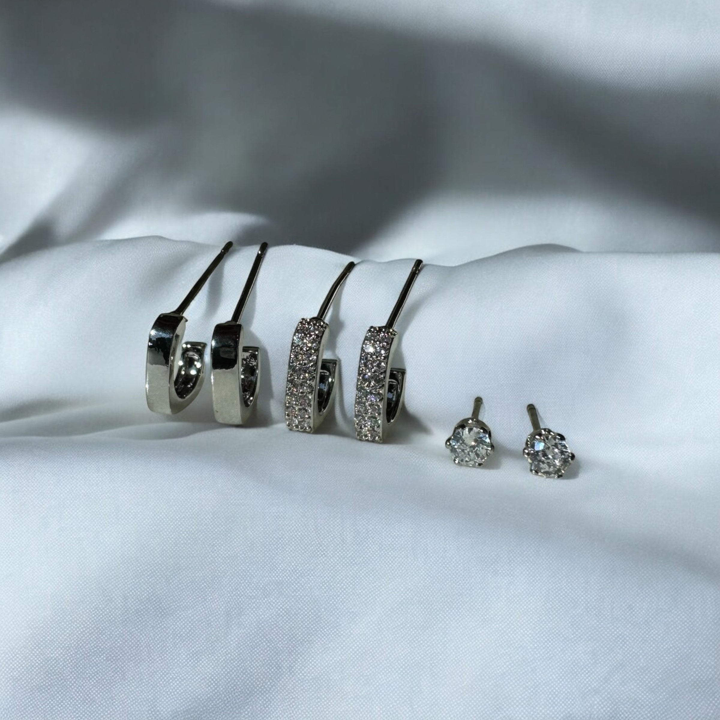 This set features six stunning earrings: two smooth huggies, two diamante huggies, and two classic studs.