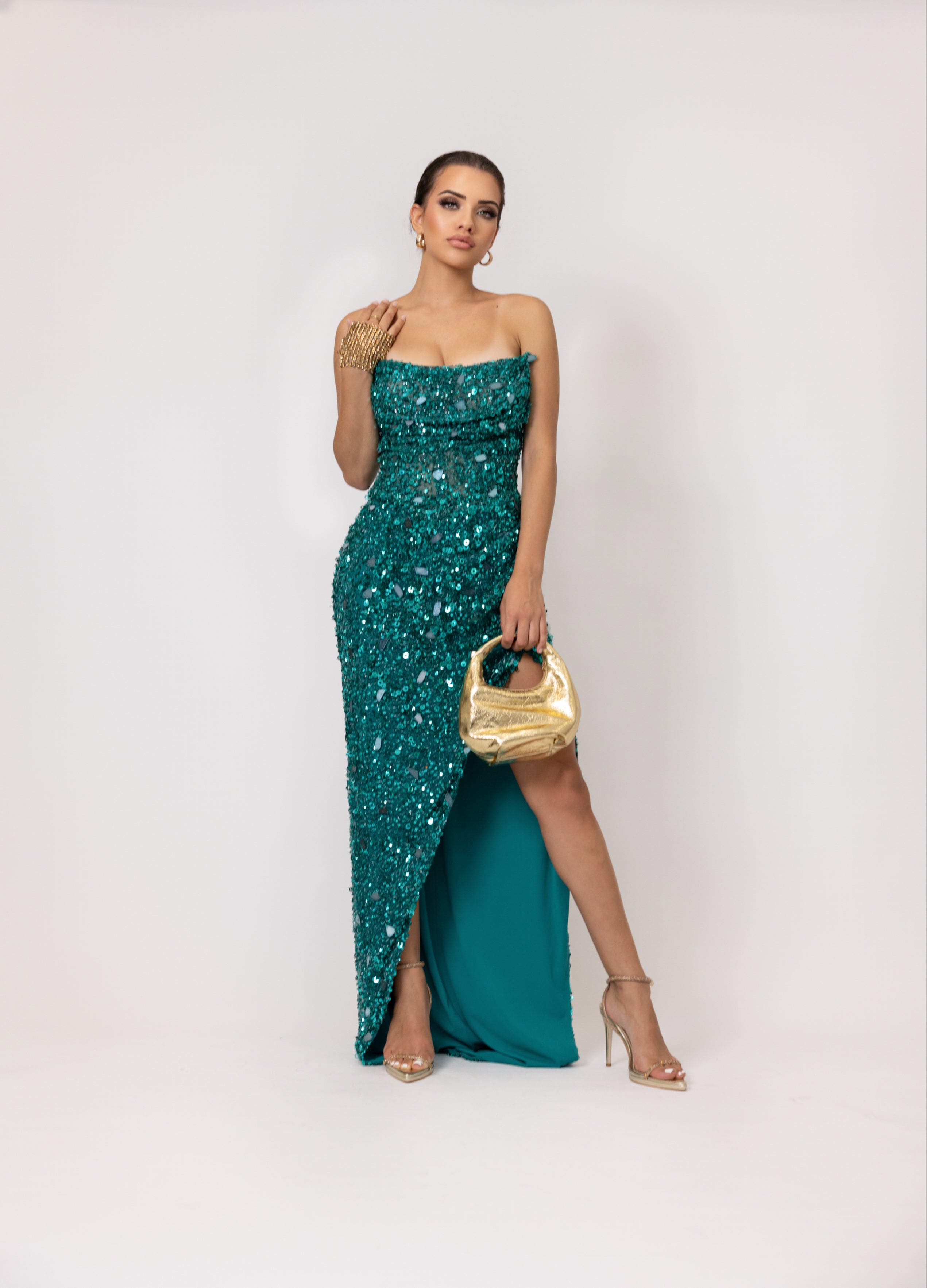 The turquoise sequined strapless fitted gown with a side split is a breathtaking masterpiece that captures the essence of elegance and allure.