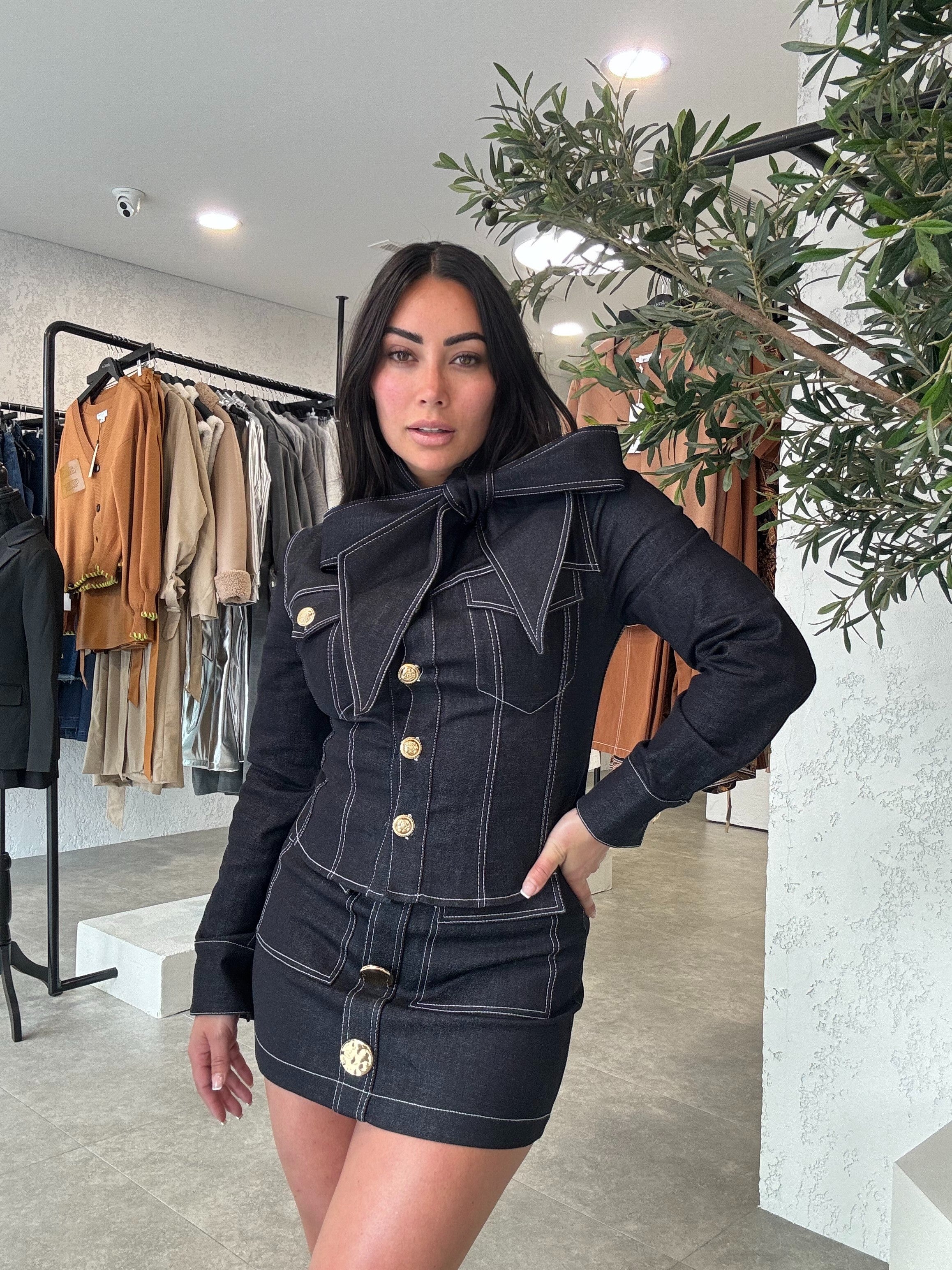 Complete your look with our matching Super Luxe Denim Skirt, designed to pair perfectly with our Bow Bliss denim top.