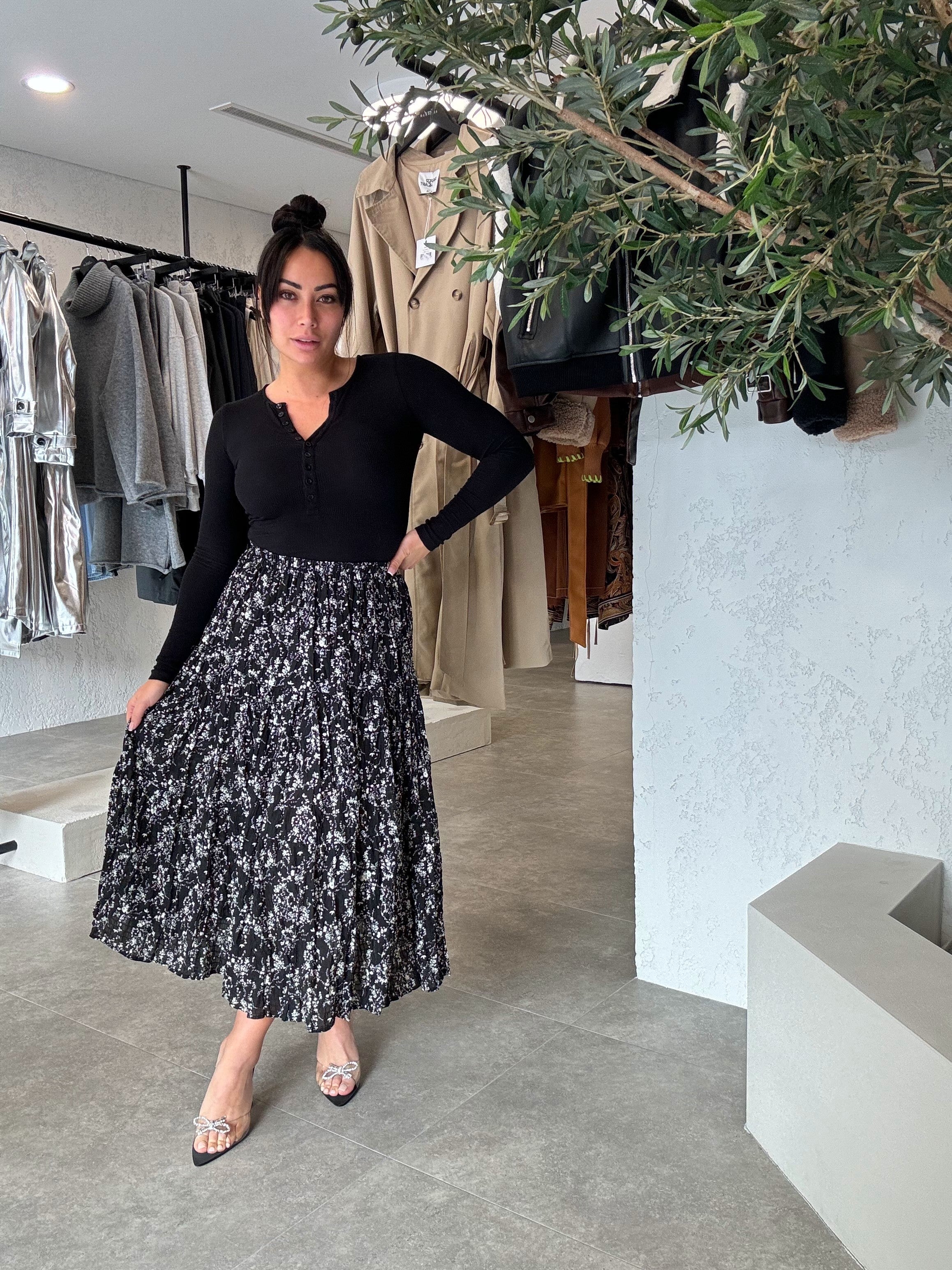 Elevate your wardrobe with our stunning black and white floral midi skirt, designed to exude elegance and class.