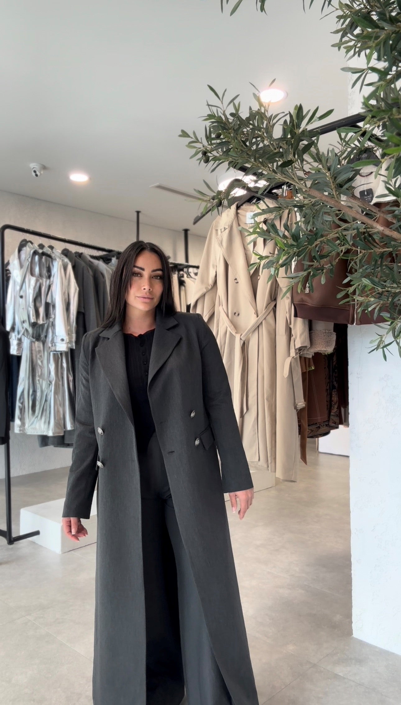 Step into timeless elegance with our Dark Grey Trench Coat.