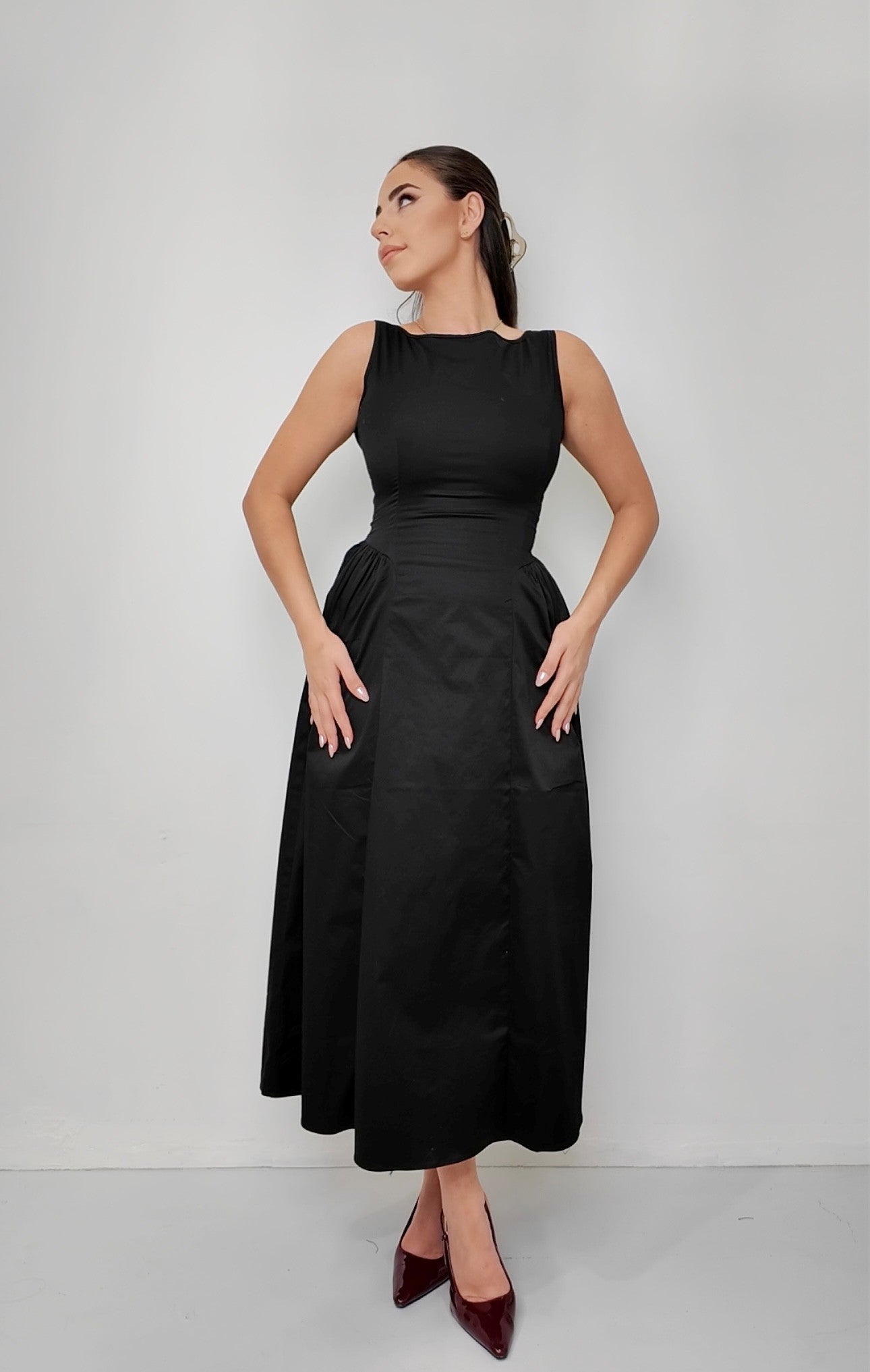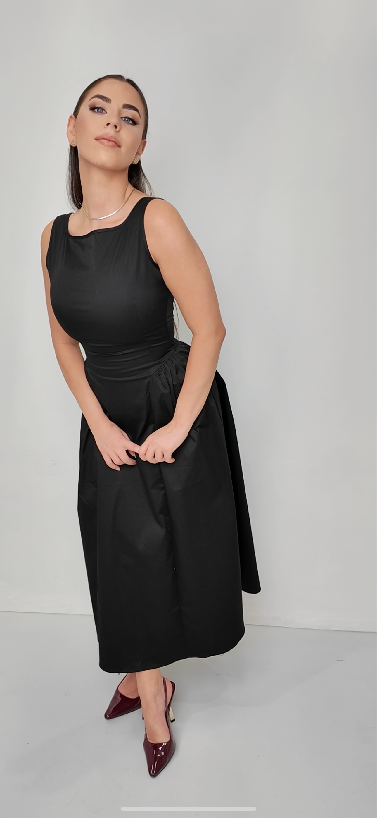 Step into effortless sophistication with our Classic Black Midi Dress, designed for the modern woman who loves elegance with a touch of vintage charm. Featuring a flattering fitted bodice and a full A-line skirt, this dress cinches at the waist to create a beautifully feminine silhouette. The high neckline adds a refined touch, making it perfect for special occasions, evening events, or even an elegant dinner date.