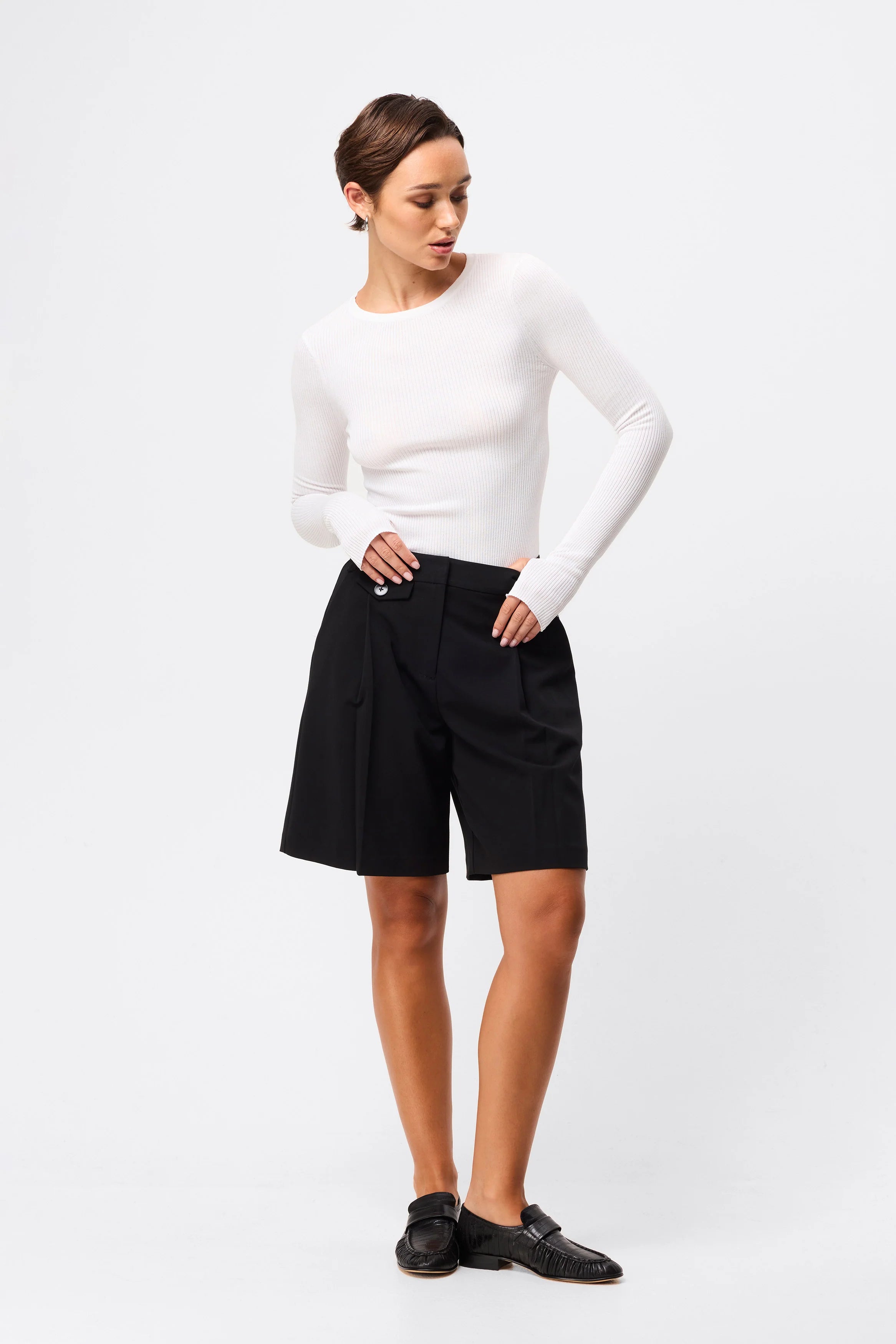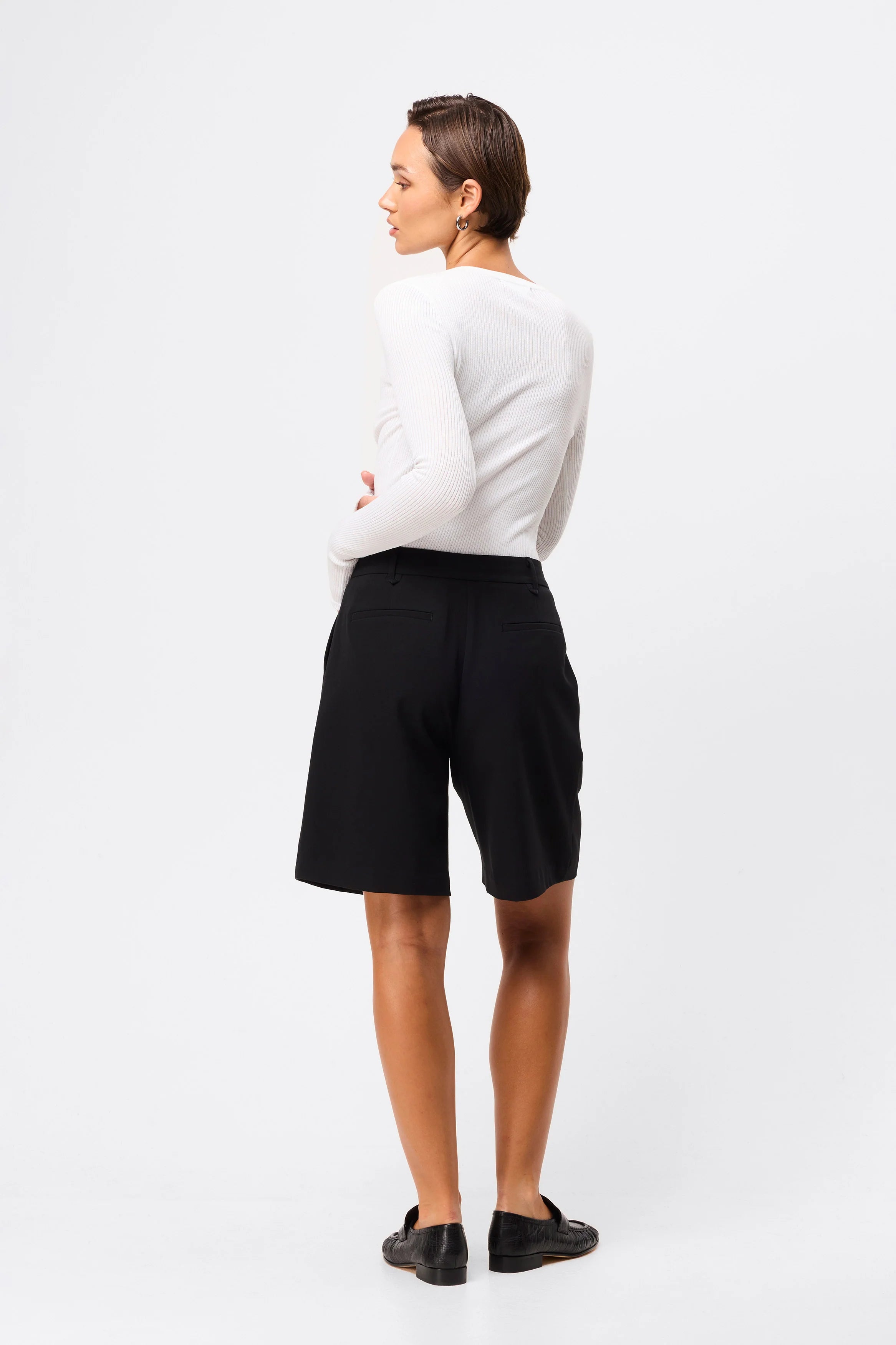 A wardrobe staple, the Boston Shorts in Black are crafted from soft suiting fabric, offering a refined yet relaxed silhouette. Designed with a flattering wide-leg cut, they feature single front pleats, functional side pockets, and coin pocket detailing at the waist for a tailored finish. Style with the By Your Side Vest for a sharp, polished look or pair with a soft knit for effortless off-duty appeal.