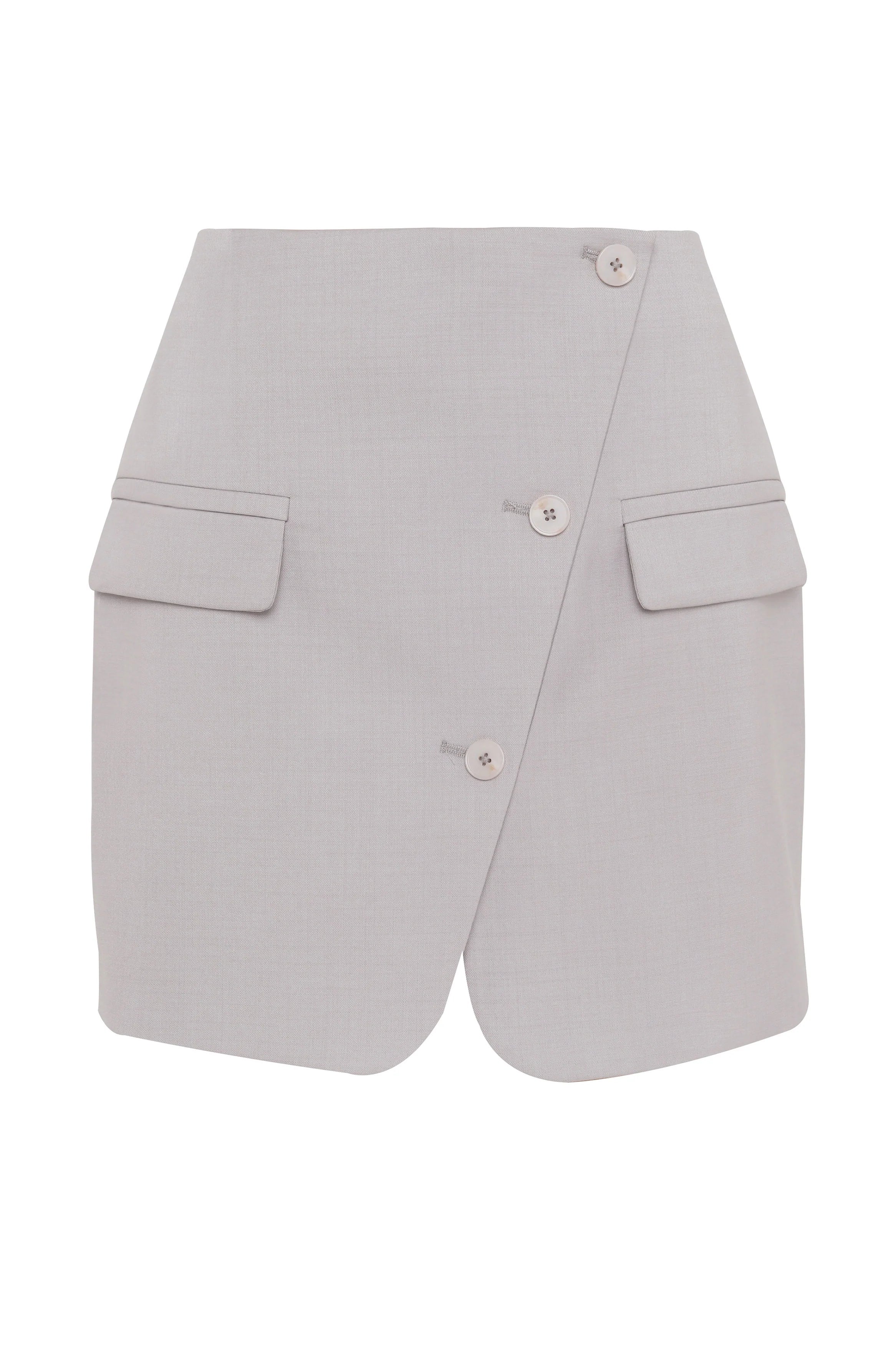 A wardrobe essential, the By Your Side Mini Skirt in Grey delivers timeless tailoring with a modern edge. This wrap mini skirt is crafted from premium suiting fabric and fully lined for a flawless fit. Featuring a sculpted silhouette with a curved hemline, front split, slanted button detailing, and jet front pockets, it offers a structured yet flattering shape. Designed for year-round wear, it pairs effortlessly with the matching By Your Side Vest for a polished set look, or with a fitted knit and tights during cooler months. Effortlessly chic, endlessly versatile, your go-to mini from desk to dinner.