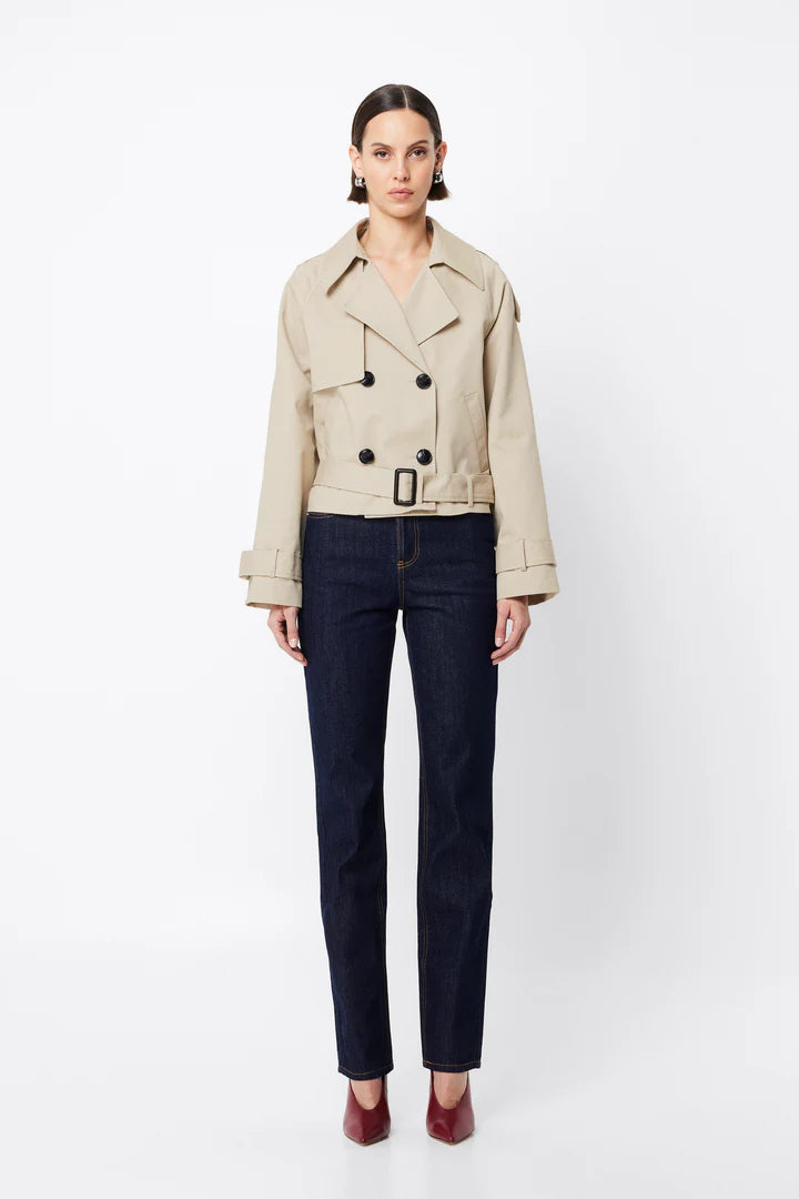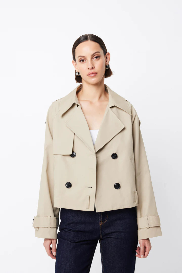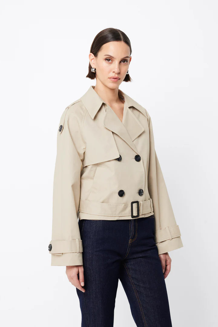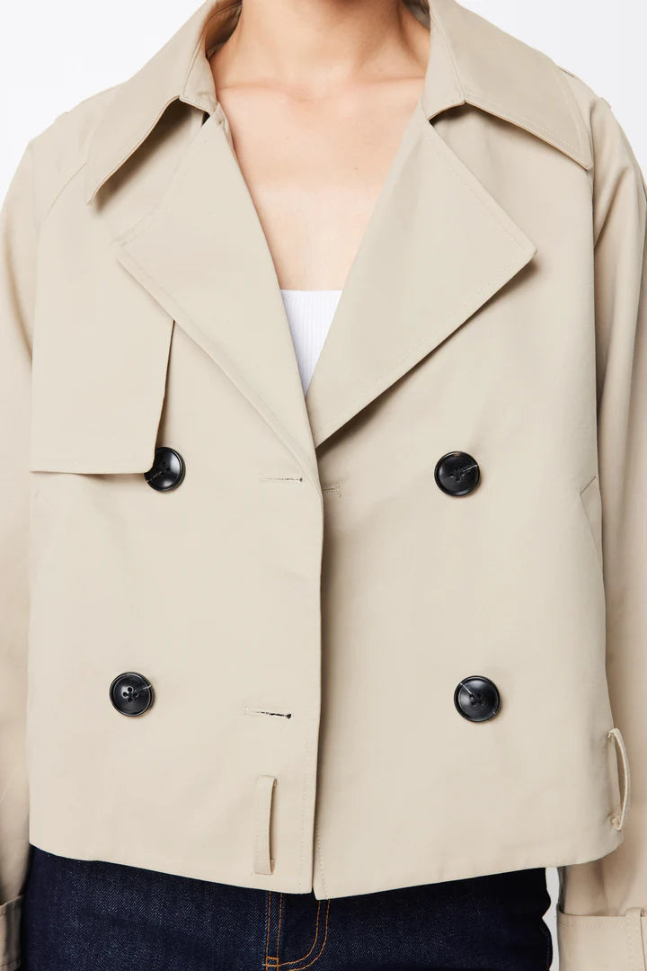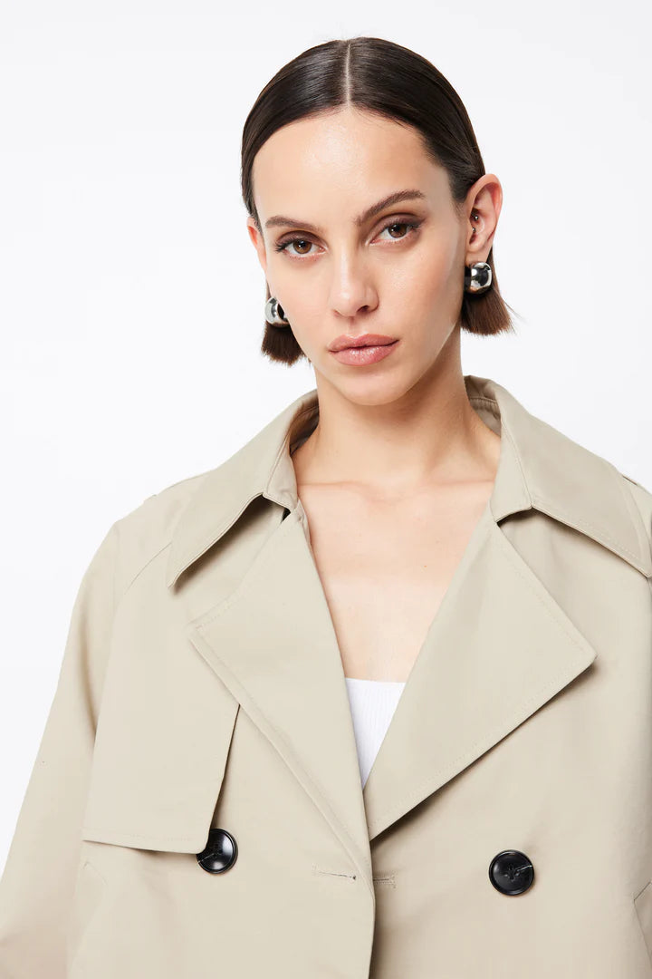 A modern take on a classic, the Franklin Cropped Trench in Natural blends structure with effortless style. Designed in a double-breasted, boxy fit, it features a structured collar, wide fabric belt, and adjustable belted cuff sleeves. Fully lined and cropped for a contemporary edge, it pairs seamlessly with denim or layered over a dress for refined sophistication. Size down for a more tailored fit.