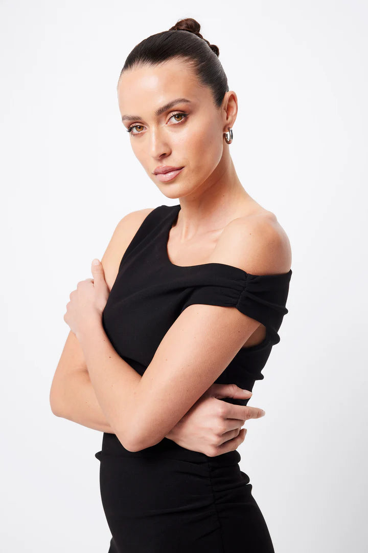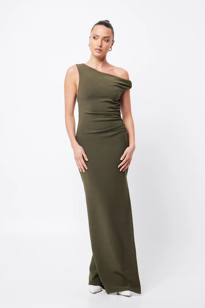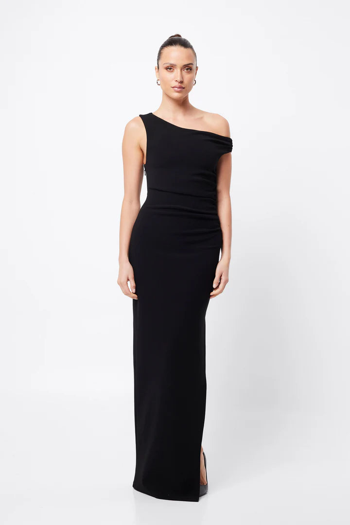 The Elated Dress in pink is designed with a one-shoulder asymmetric neckline, a cinched waistline, and side-ruched detailing for a flattering fit. A bold side split adds a modern edge, making it the perfect choice for your next event. Style with your favourite heels to complete the look.