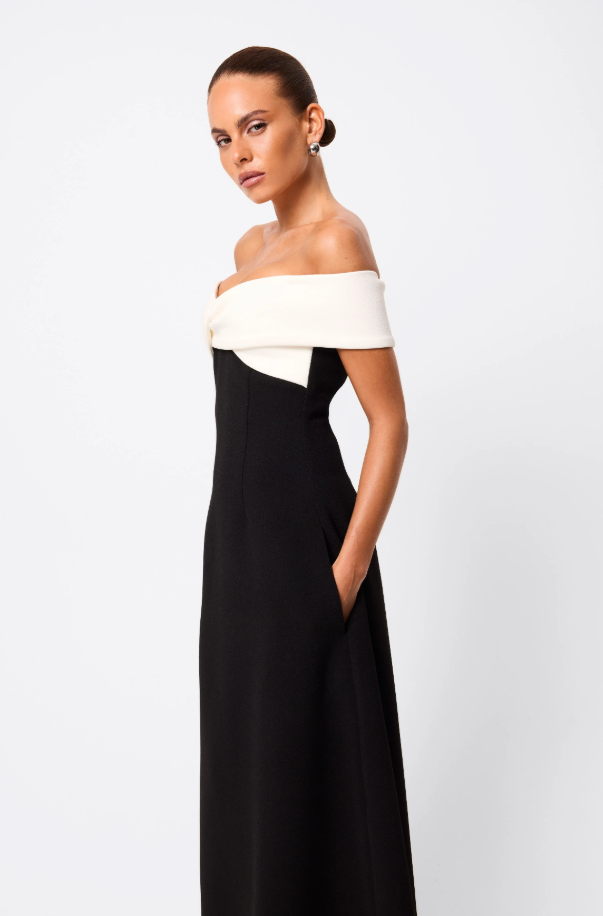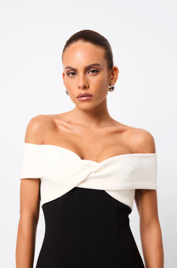 Embrace timeless elegance in the Eternal Maxi Dress in black — a striking silhouette that epitomises modern femininity. Crafted from a fused crepe fabrication, it features a contrast white, folded twist bust detail and a classic off-shoulder bardot neckline. The structured bodice sculpts the figure before flowing into a full-length A-line skirt, while a contrast exposed centre-back zipper introduces a contemporary edge. Flattering for all body types, this statement style is destined to captivate with its effortless grace and enduring sophistication.