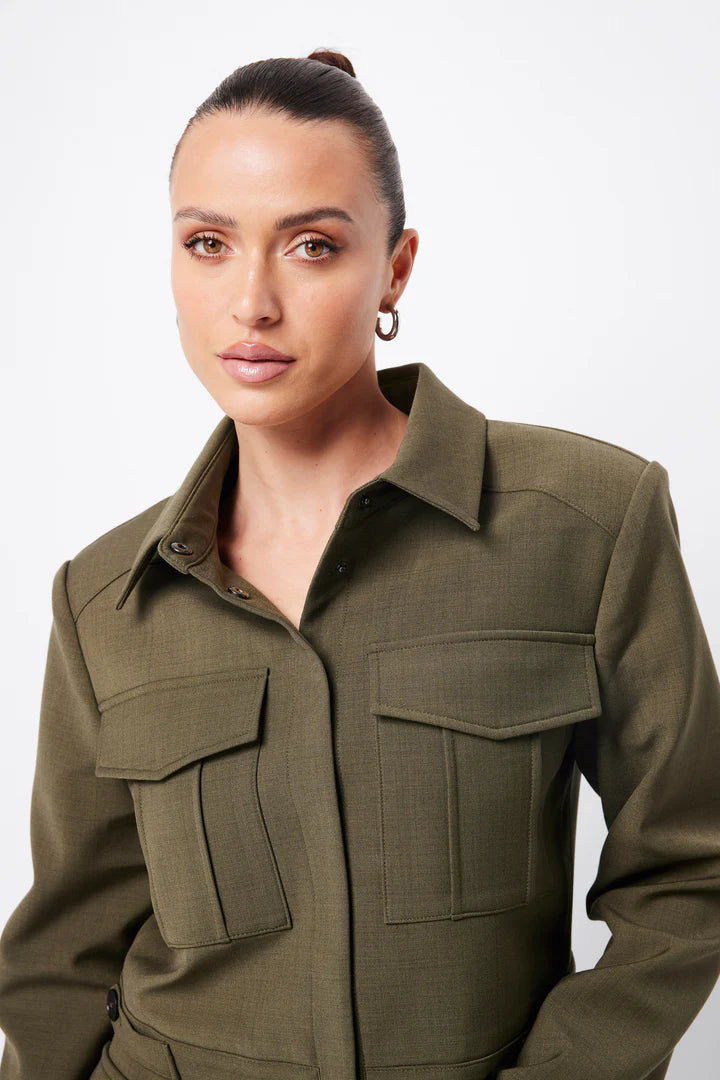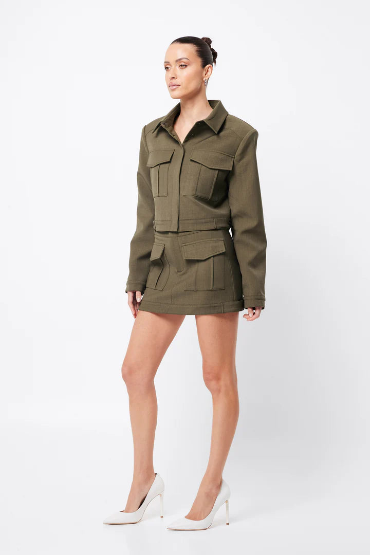 The Low Profile Jacket in khaki is a stylish twist on a utility classic. Designed with functional cargo-style front pockets, concealed stud fastening and a structured collar, this cropped jacket is modern versatility at its best. Perfect with the coordinating mini skirt or midi dress, it's also a fresh update to your favourite denim jeans.