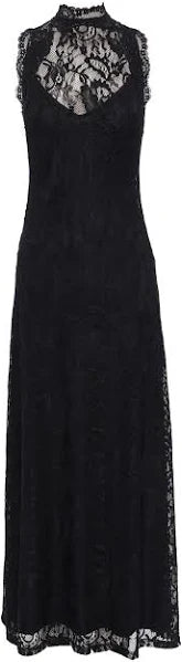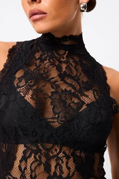 The Laced Inlove Maxi Dress in classic black is designed to captivate with its daring elegance and sultry charm. Crafted from intricate floral lace, this partially lined silhouette features a high neckline, sleeveless design, and sheer panelling that offers a bold yet sophisticated look. The fitted bodice flows into a floor-length skirt with an alluring sheer overlay, creating a dramatic, feminine silhouette perfect for your next evening event or formal occasion. Pair with sleek heels and minimalist jewellery to let the dress speak for itself.