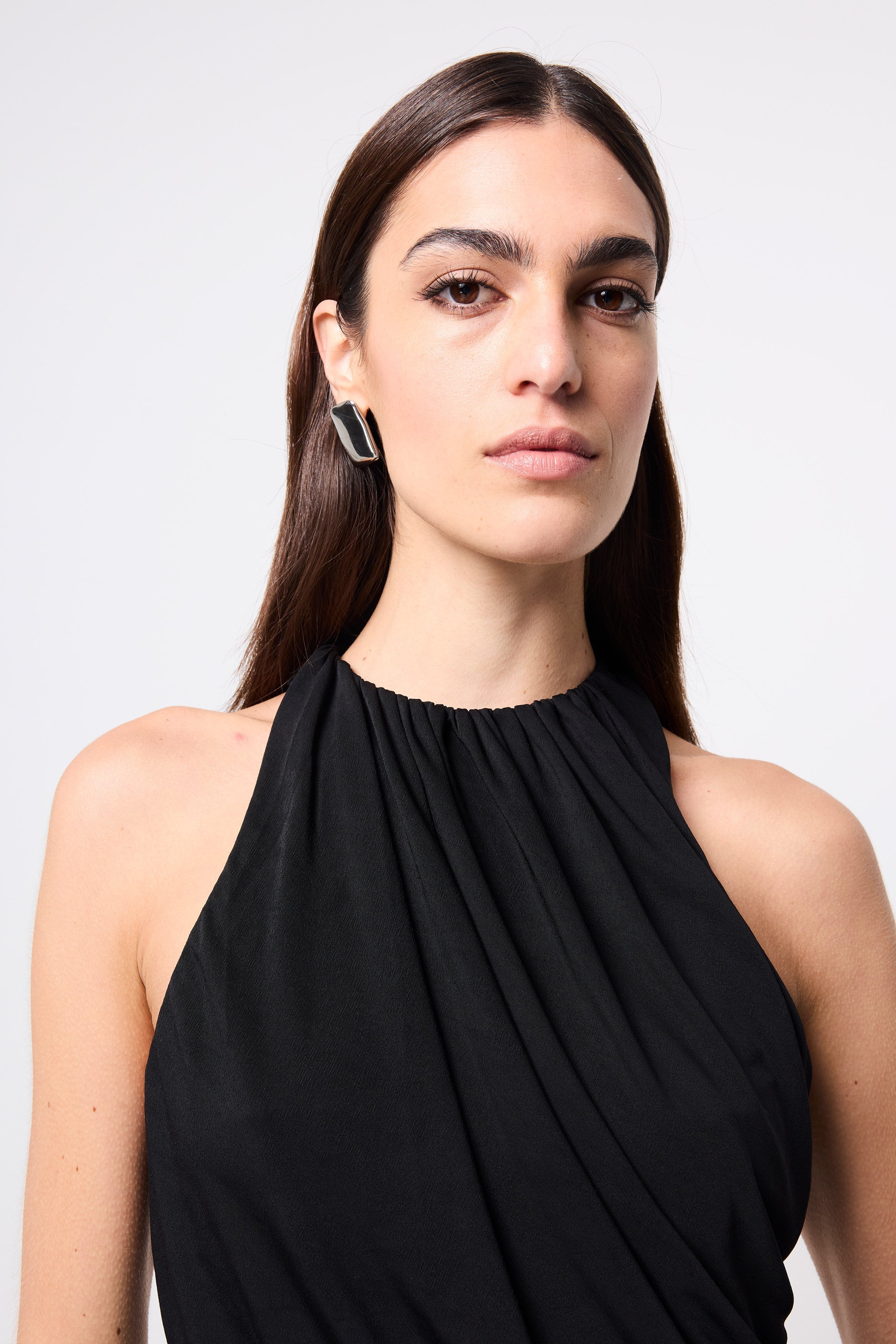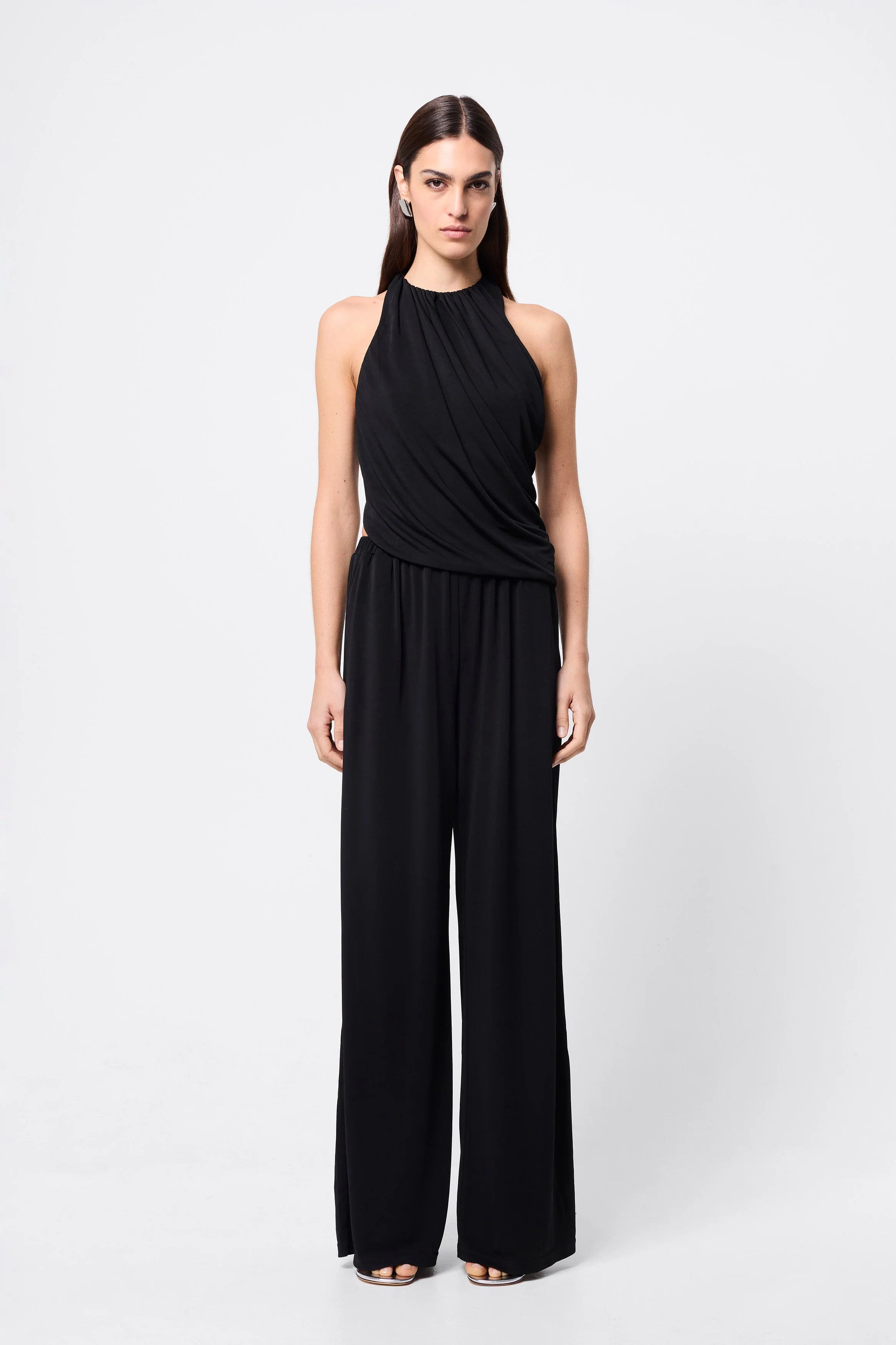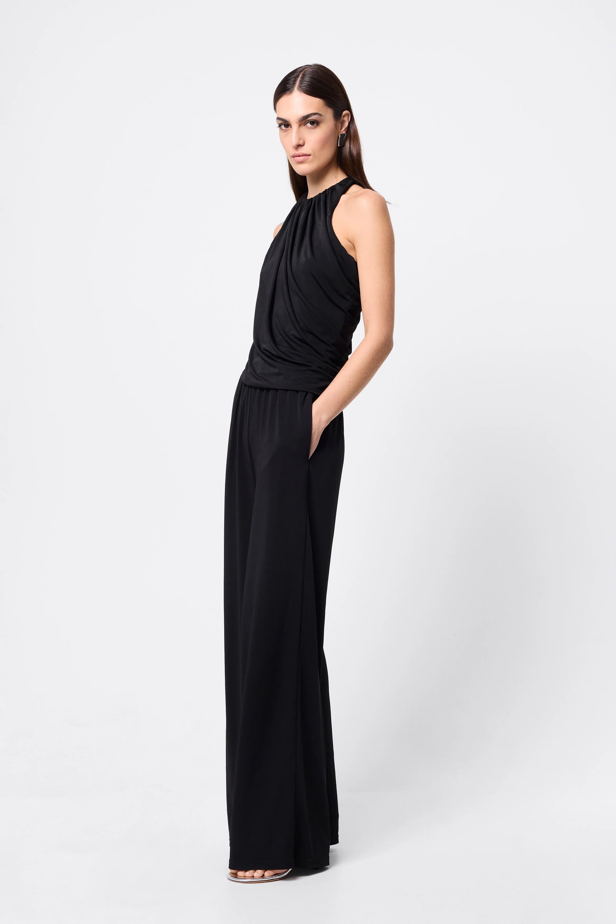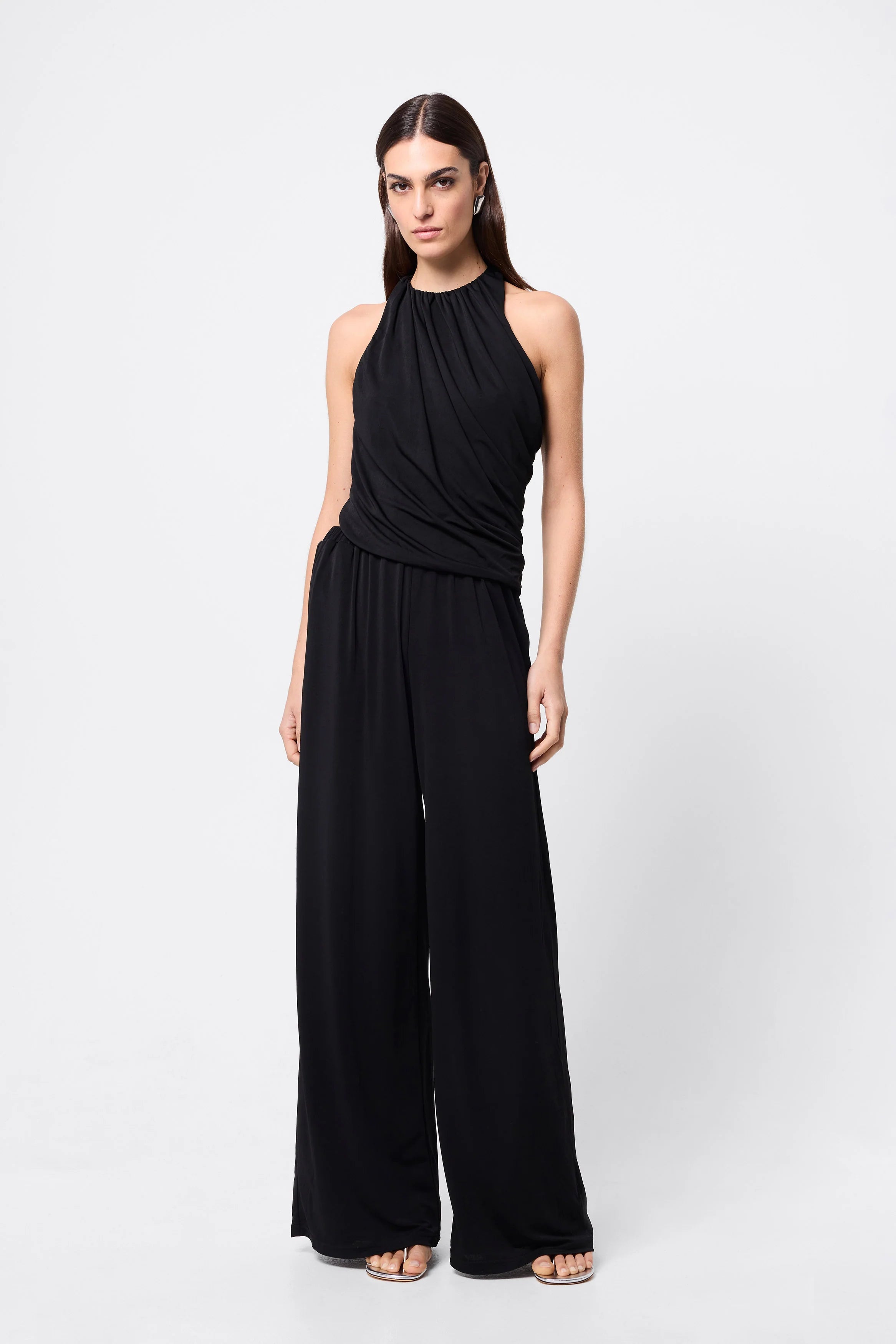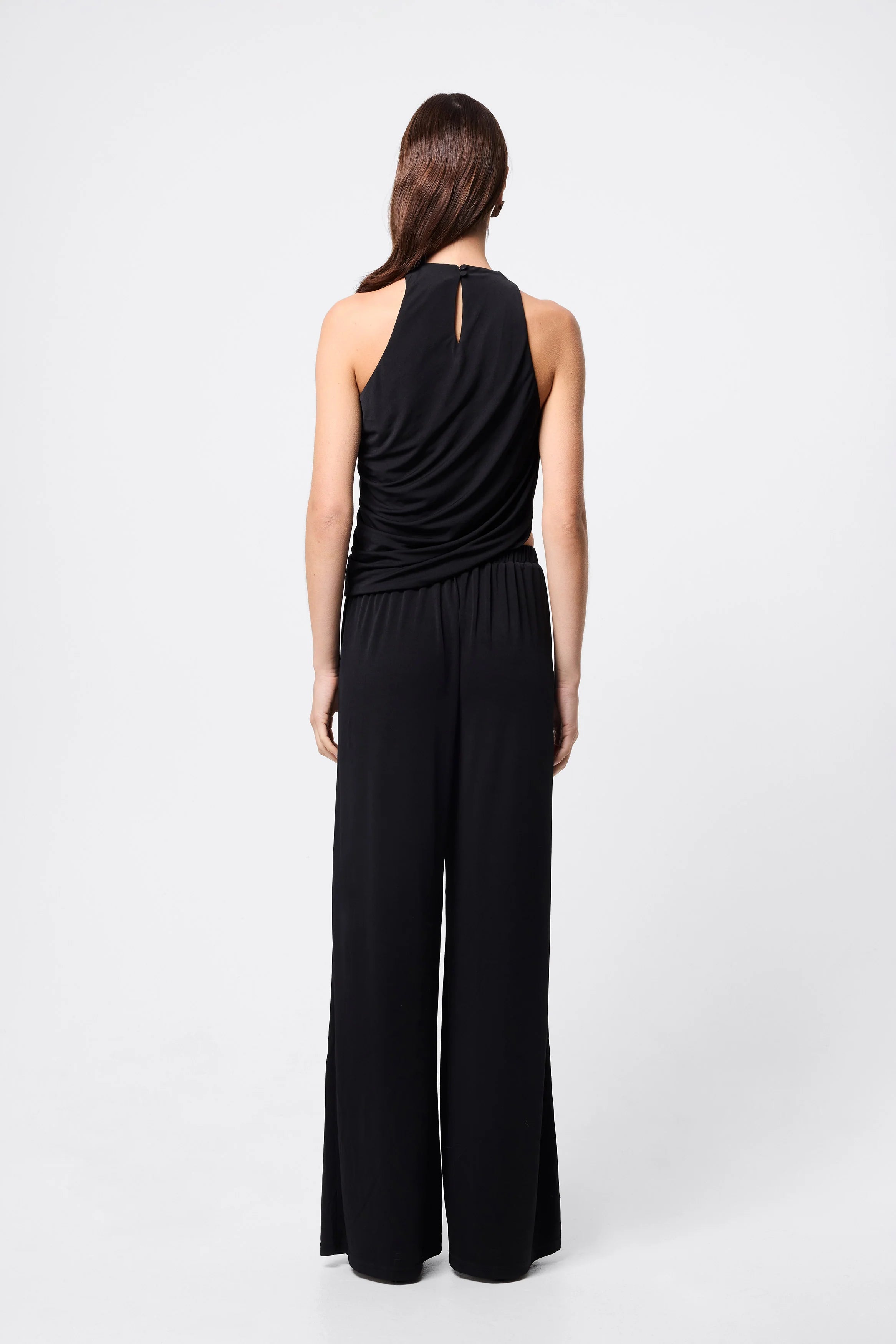 The Free Falling Top in Black embodies effortless sophistication and modern versatility. Crafted from a premium draped jersey fabrication, this sleeveless silhouette features a racer neckline and an asymmetric waist with soft draping that flatters the form. A delicate button closure at the neck adds refined detail, while the fluid shape ensures graceful movement. Perfect for both day and evening, pair it with the Free Falling Pant for a monochromatic look or style it with denim for a relaxed weekend edit.