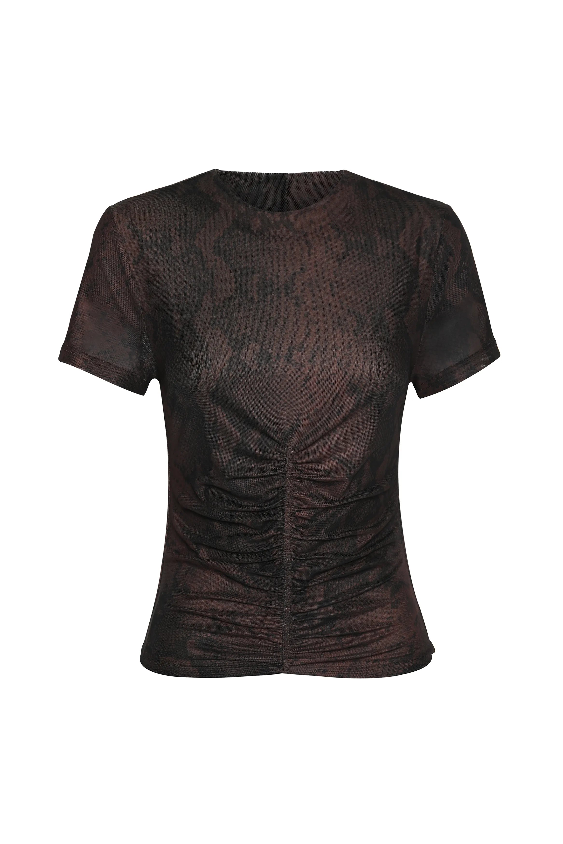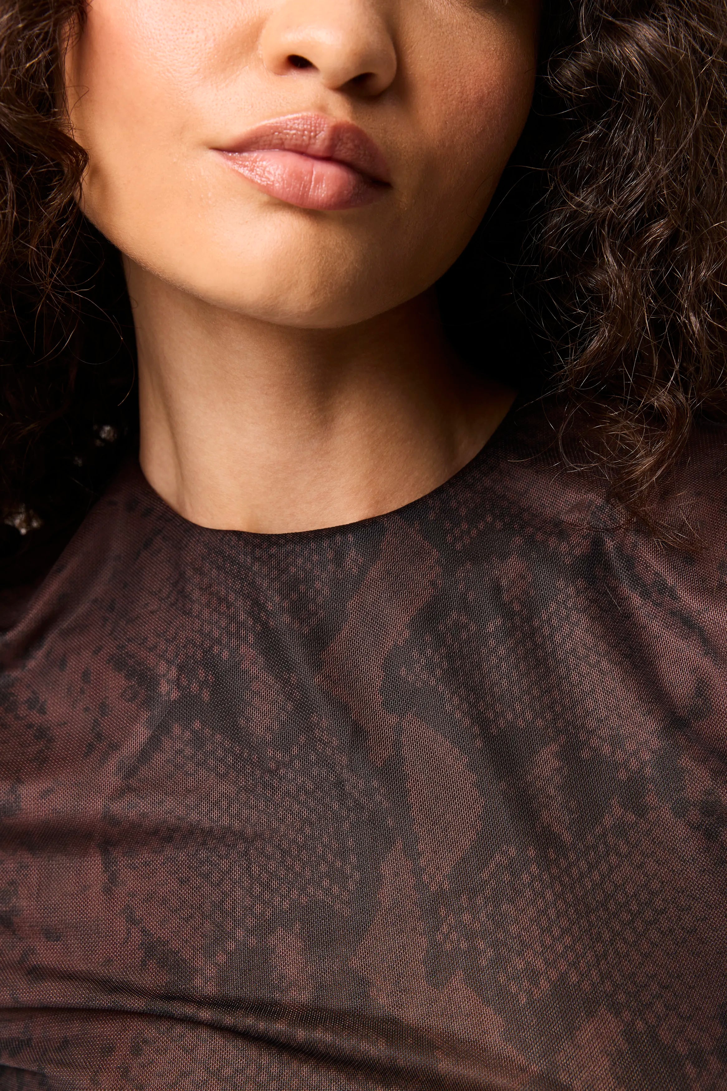 The Siren Short Sleeve Top is a statement in subtle seduction. Crafted from sheer mesh with a brown snake print, it contours the body with soft gathering and exposed topstitch detailing down the front, creating a flattering, sculpted silhouette. Lightweight and semi-transparent, it is fully lined in nude self-fabric, and features a crew neck and cap sleeves. Designed to layer or stand alone, it brings texture and depth to elevated day or night looks. Effortlessly bold, this piece moves seamlessly from understated to striking.