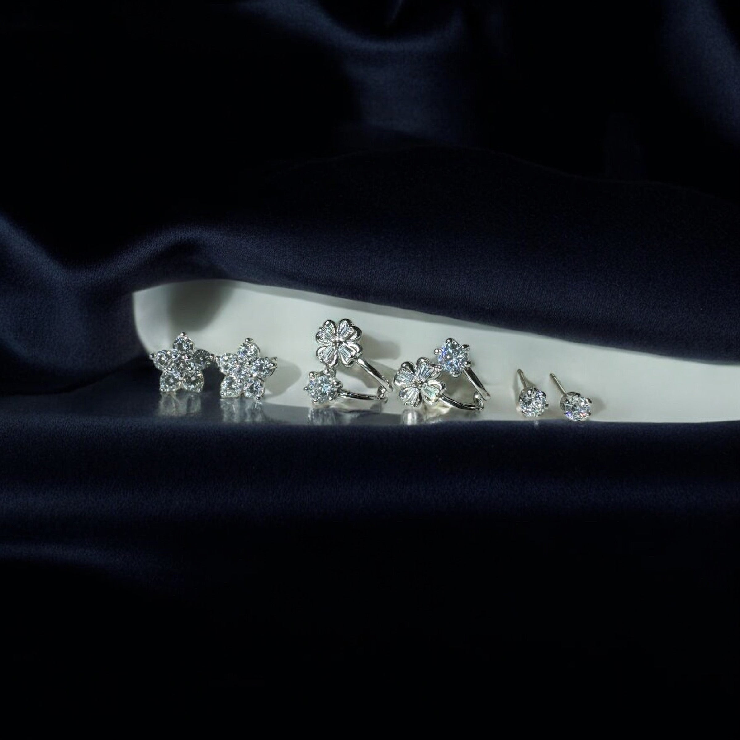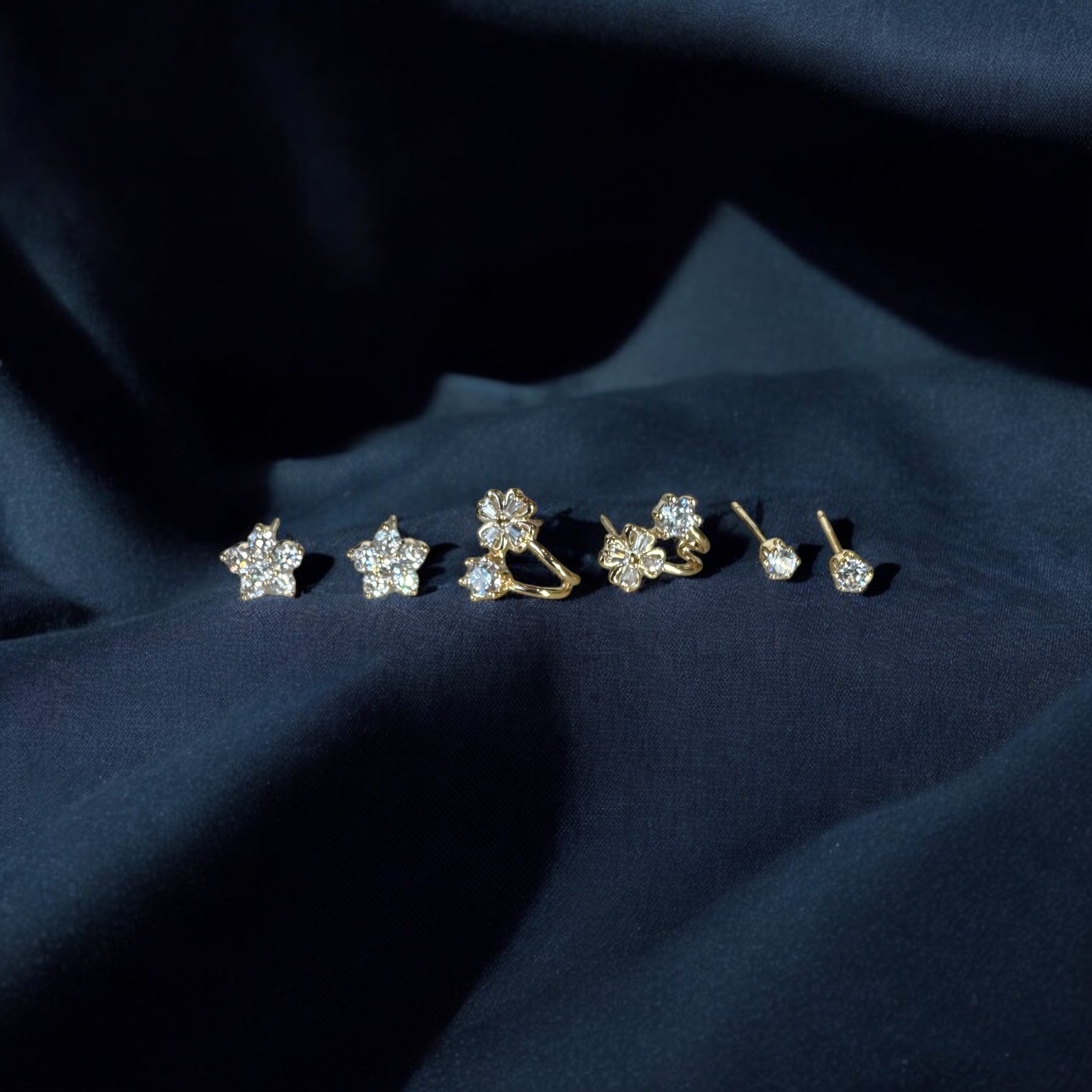 This set includes six exquisite earrings: two floral studs, two floral and solitaire huggies, and two classic studs.