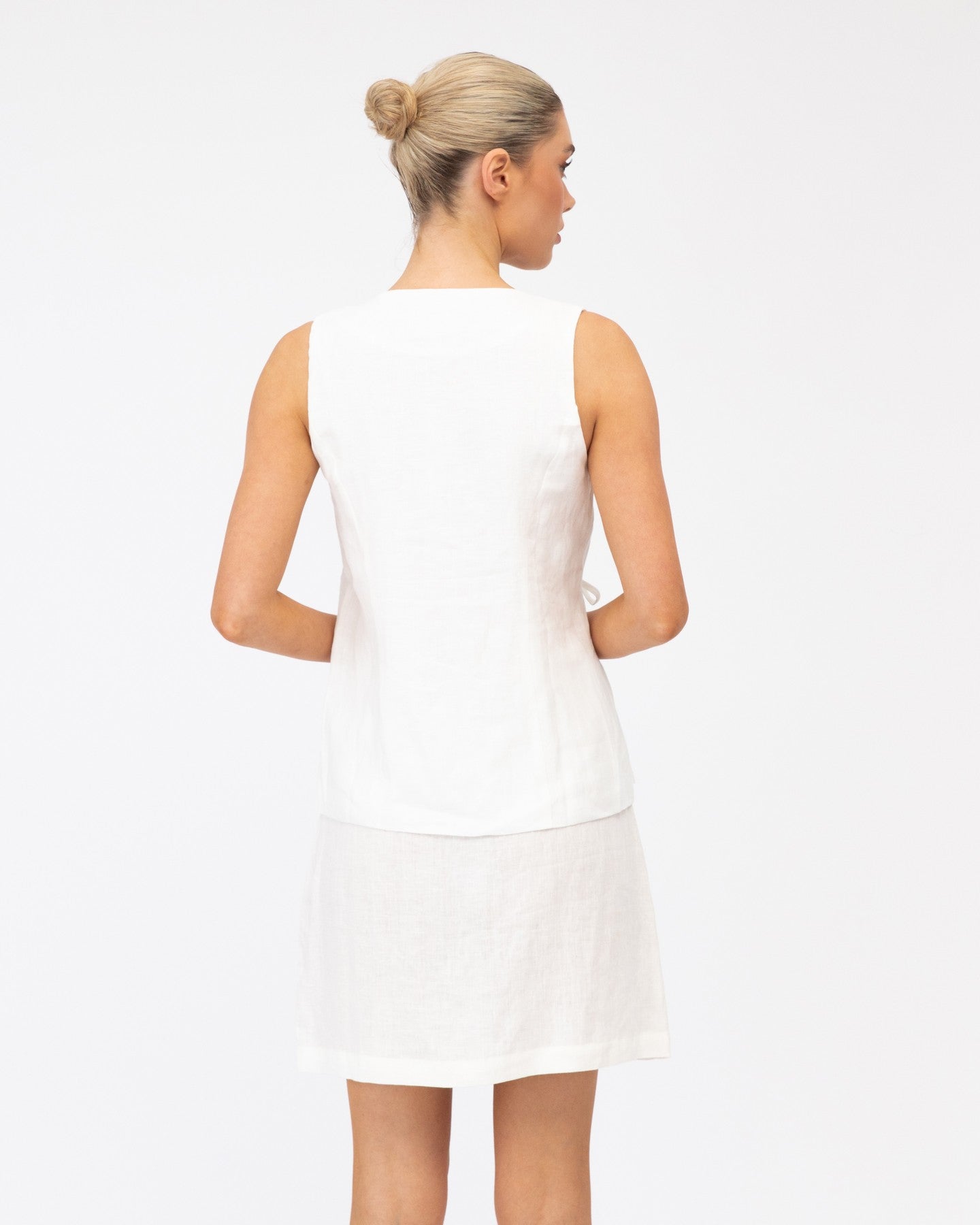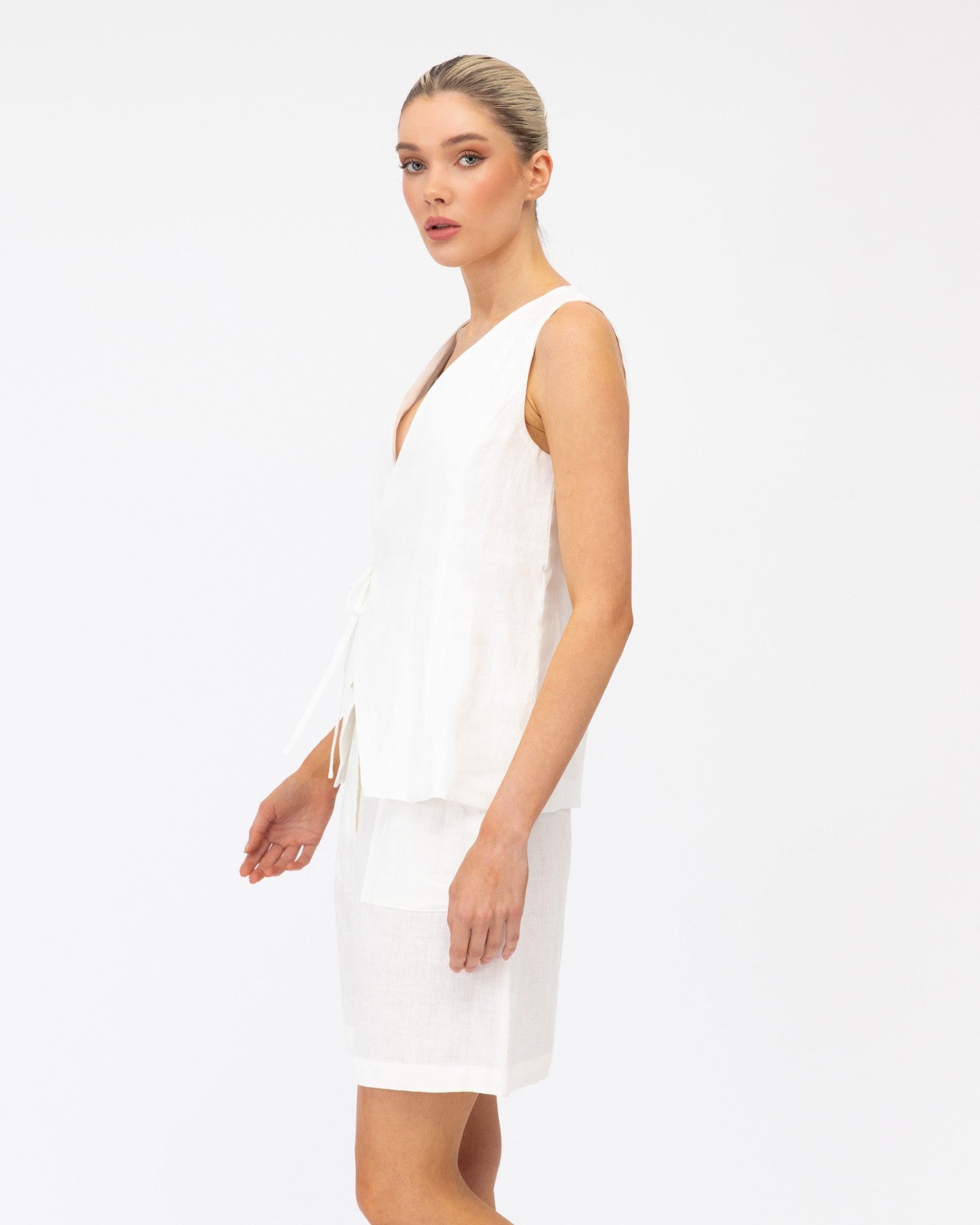 The Odet top is a relaxed wrap vest fit. 100% Linen, Fully lined.